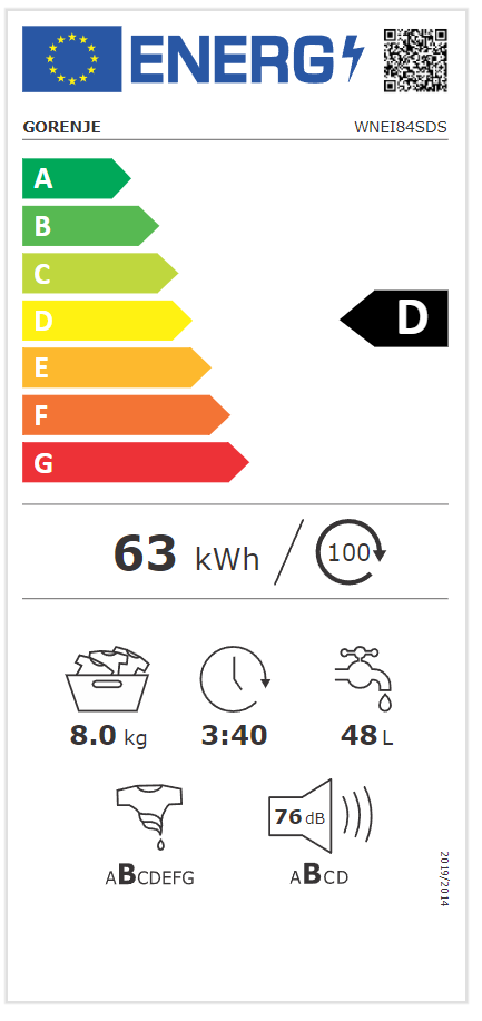 Ražotājs: GorenjeUzstādīšanas veids: Free standingVeļas mašīnas veids: Front loadMazgāšanas ietilpība: 8Maksimālais apgriezienu skaits: 1400JAUNA Energoefektivitātes klase: DElektroenerģijas patēriņš 100 ciklos: 63Ūdens patēriņš 1 ciklā: 48Trokšņu līmeņa klase: BTrokšņa līmenis: 76Cikla ilgums: 220Viedā mazgāšanas tehnoloģija: NoAtvilktne kapsulām: NėraTvaika tehnoloģija: Ar tvaikuMotora veids: InverterDispleja veids: Electronic with LCDWi-Fi: navAizsardzība pret ūdens noplūdi: irProgrammu skaits: 16Ātrās mazgāšanas programma: irAizkaves funkcija: PradžiosBērnu drošības aizsardzība: irAugstums: 85Platums: 60Dziļums: 46.5Maksimālais dziļums: 49.5Krāsa: WhiteIespēja pievienot veļu pēc programmas sākšanas: irApģērbu saudzējošs bundulis: irAutomātiskā dozēšanas tehnoloģija: navBunduļa izgaismošana: navCentrifūgas efektivitātes klase: CStandartizēts augstums: 85Standartizēts platums: 60